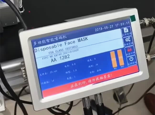 全自動口罩噴碼機采用TIJ2.5熱發(fā)泡噴頭,主頻可達1.4GHz四核處理器,噴印距離:2-5mm可保證最佳噴印質(zhì)量。系統(tǒng)運行穩(wěn)定性強,觸屏操作有絲綢滑過般的流暢感。