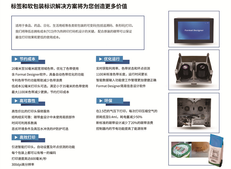 產(chǎn)品簡(jiǎn)介:適用于食品、藥品、日化、生活用紙等各類(lèi)軟包裝的可變碼(包括追溯碼、條形碼)打印。我們將降低總擁有成本(TCO)作為熱轉(zhuǎn)印打碼機(jī)設(shè)計(jì)的關(guān)鍵,配合原裝的碳帶可以保證最佳打印效果和更低的使用成本。